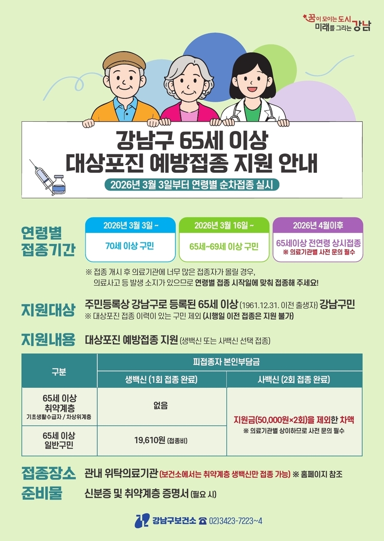 [한국시니어신문] 강남구(구청장 조성명)가 65세 이상 강남구민을 대상으로 대상포진 예방접종 지원을 확대한다. 기존 기초생활수급자 중심의 지원을 65세 이상 전체 구민으로 넓히고, 3월 3일부터 연령별 순차 접종을 시행한다.